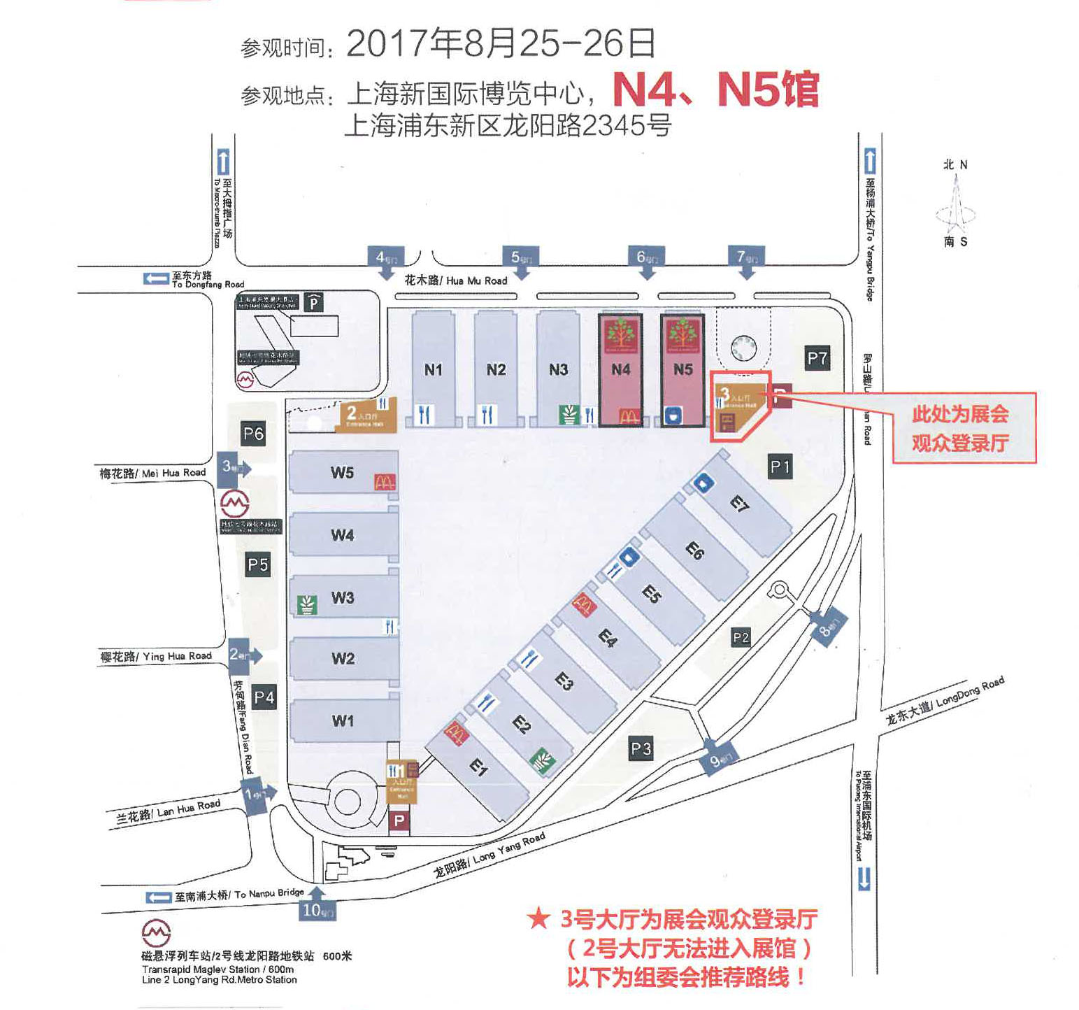 地鐵路線:地鐵7號(hào)線至龍陽路站下,搭乘康復(fù)展專用接駁車輛或步行至3號(hào)入口登錄大廳。